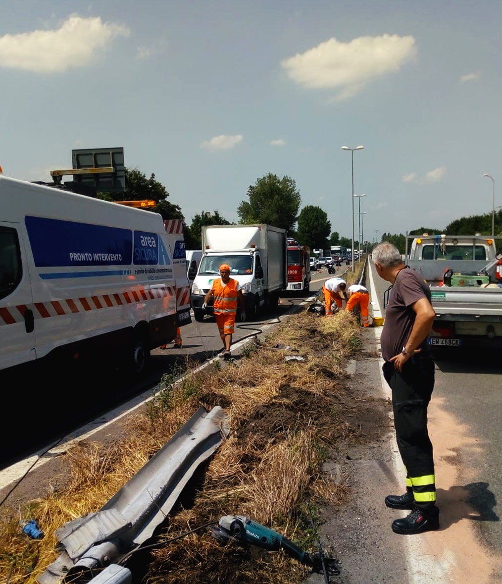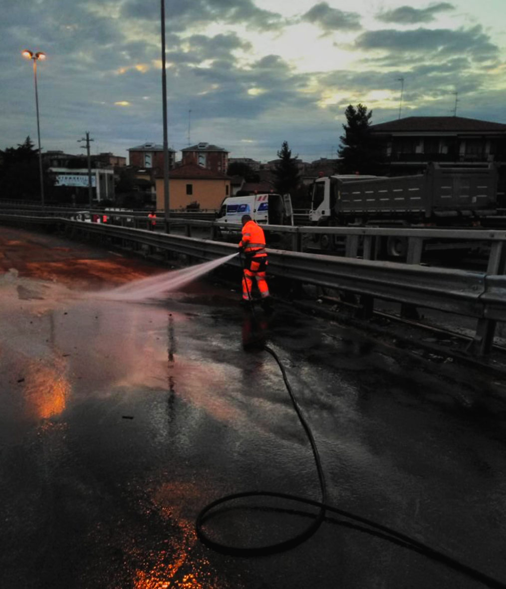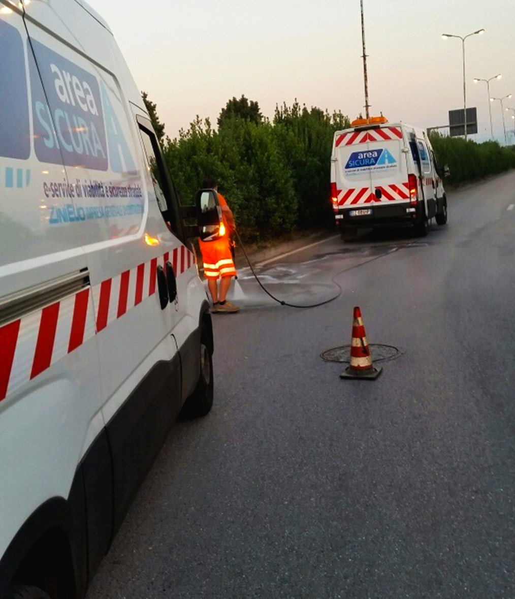 Giunti sul luogo dell’incidente, le squadre di Area Sicura provvedono alla gestione dell’area per consentire il ritorno alla regolare e sicura circolazione dei veicoli. Le attività degli operatori comprendono: Pulizia dell’area da detriti, oli e idrocarburi; Rimozione e smaltimento del carico perduto da veicoli; Messa in sicurezza di pericoli sulla strada, danni alle infrastrutture e piccoli interventi di manutenzione (es. riposizionamento di segnaletica verticale non compromessa.
